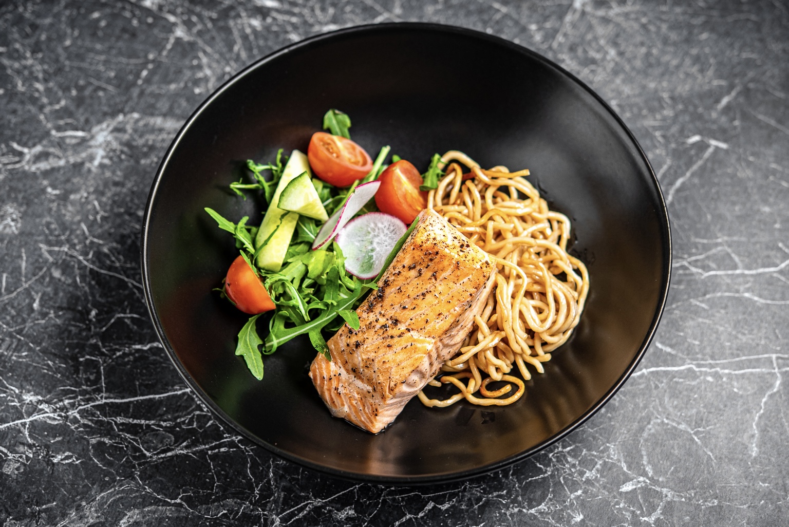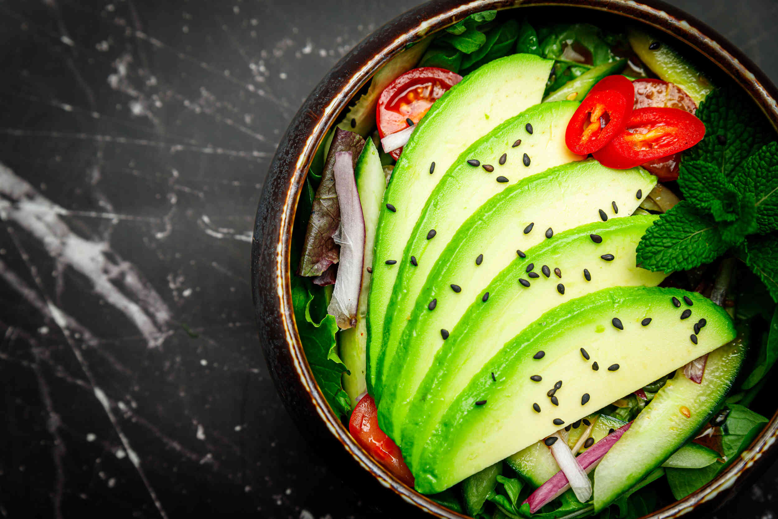 värske salat, mereannid, praetud tiigerkrevetid ingveri, küüslaugu ja sidrunheinaga, avokaado, kirsstomatid, aasiapärased kurgid
