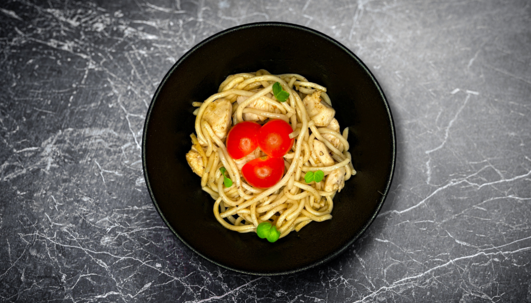 hiina kollased nuudlid, marineeritud veiseliha, paprika, küüslauk, tšilli, sojakaste, roheline sibul, seesamiseemned